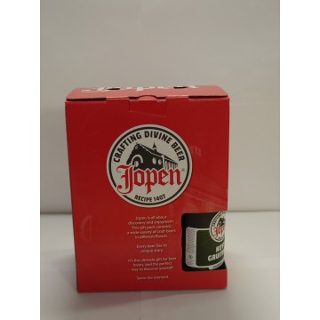 Biercadeau met drie Jopen bieren en een bokaal.